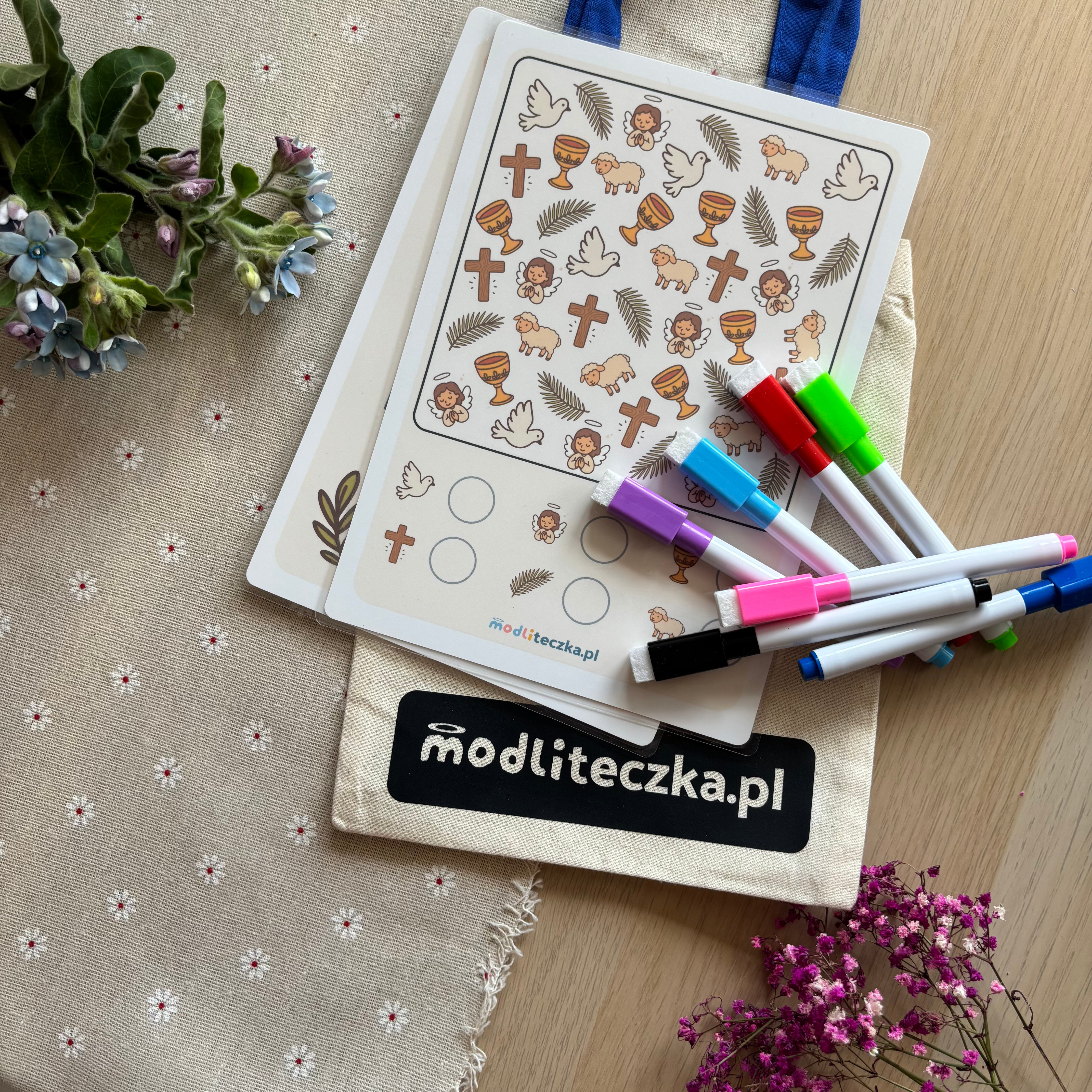 Modliteczka to ja – mama, która zaczęła od własnych dzieci. Robię wszystko własnoręcznie: projektuję, drukuję, laminuję, składam, pakuję. Karty powstały w domu, przy kuchennym stole – najpierw dla moich maluchów, by miały czym zająć rączki podczas mszy i były spokojne. Zauważyłam, że zwykłe kolorowanki nie pasują do kościoła. Chciałam, by dzieci nie tylko rysowały, ale i dotykały wiary: tak powstały pierwsze karty z motywami biblijnymi.